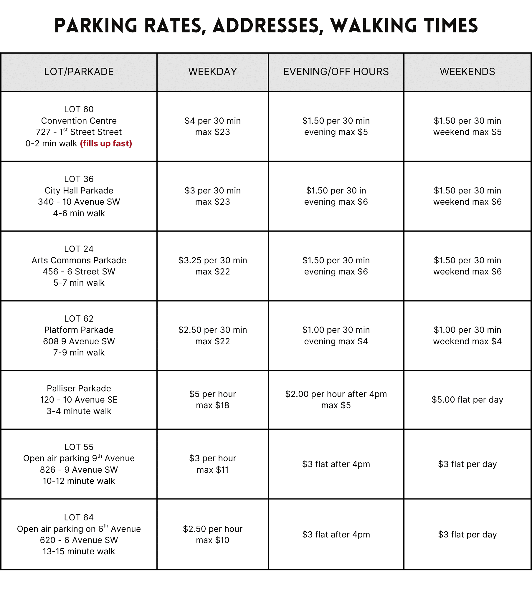Lot 60 Convention Centre Parkade (727 – 1 St SE) Closest parking, fills quickly
